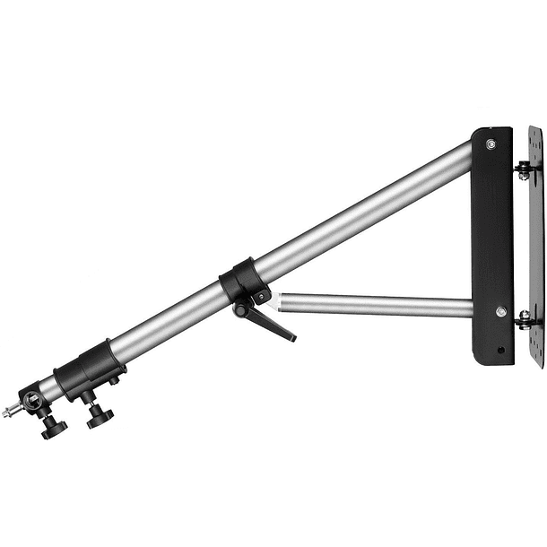 Pluma fija a pared, con la posibilidad de estirarse hasta 1,7 mtrs aproximadamente. Perfecta para colocar luces continuas o flashes en posición Cenital, con la posibilidad de cambiar su espiga de 1/4 a 3/8 para focos más pesados.